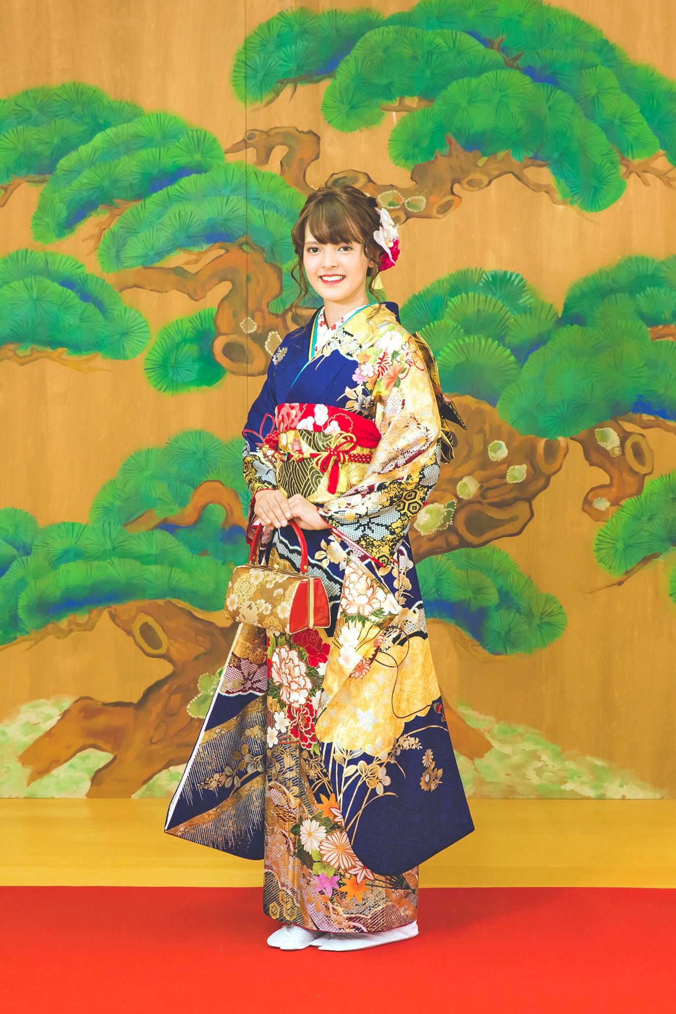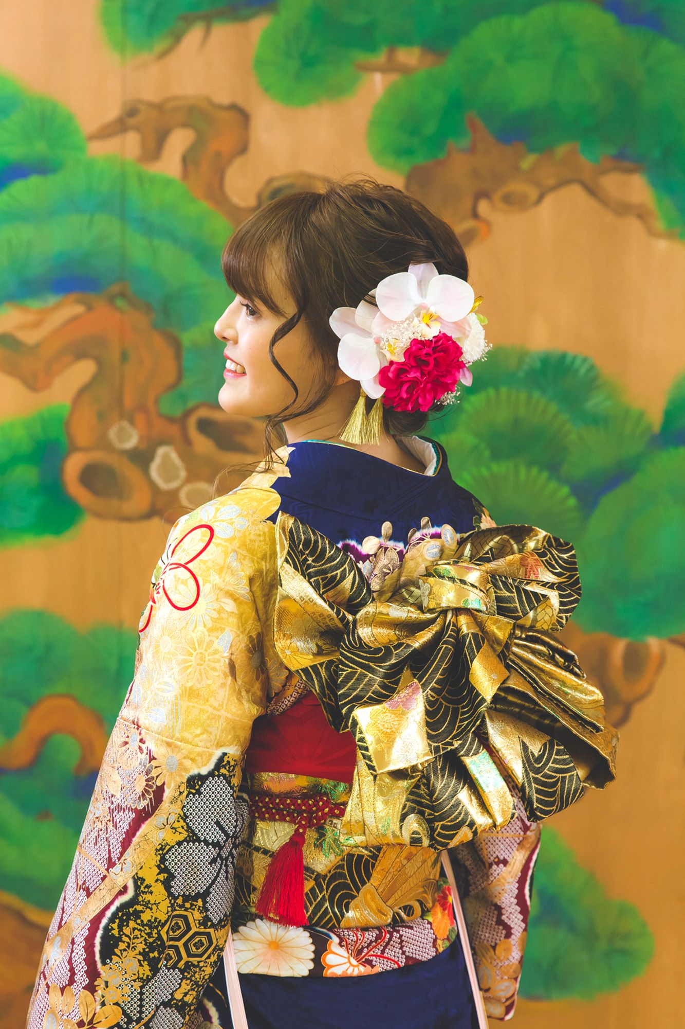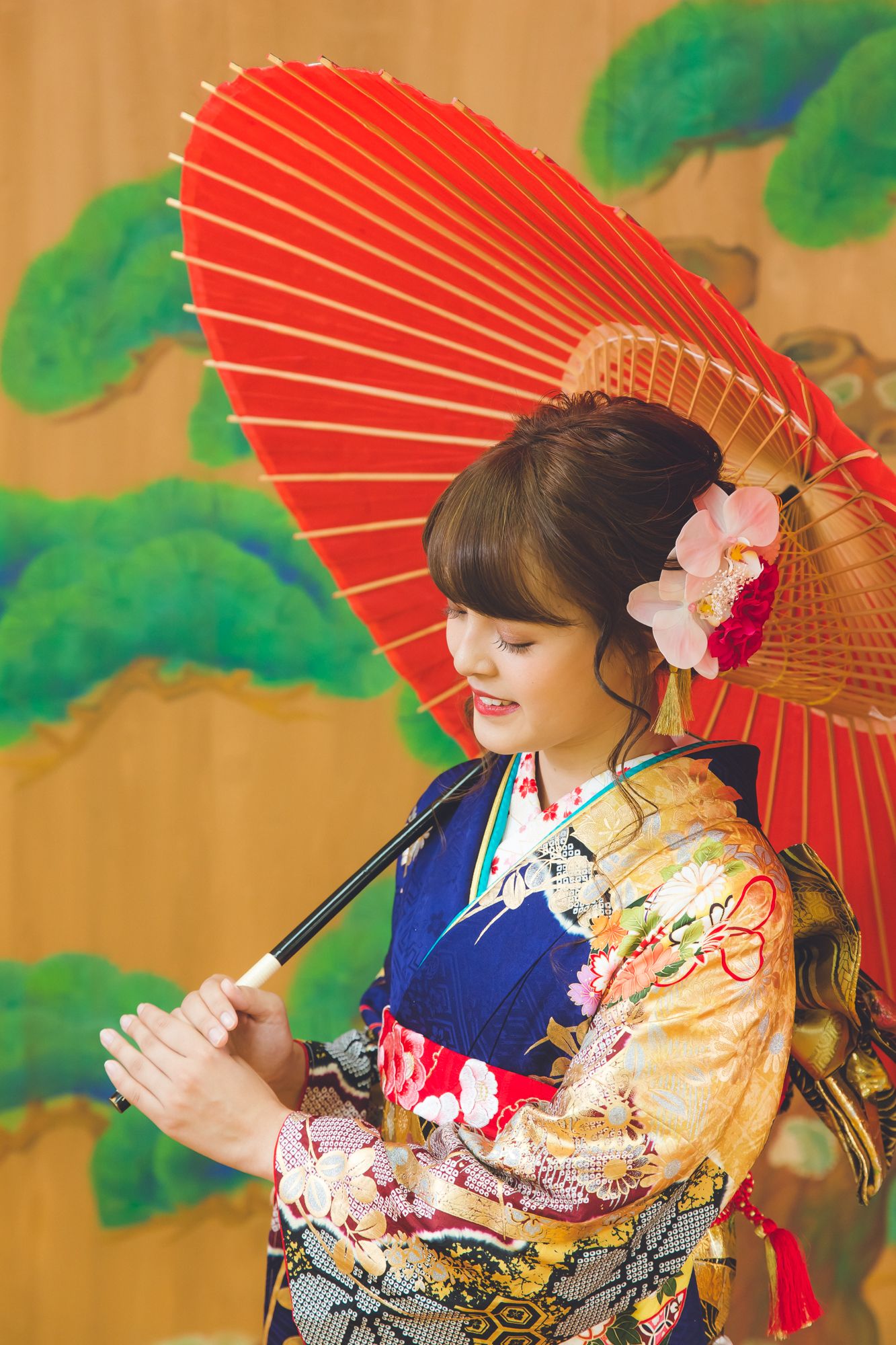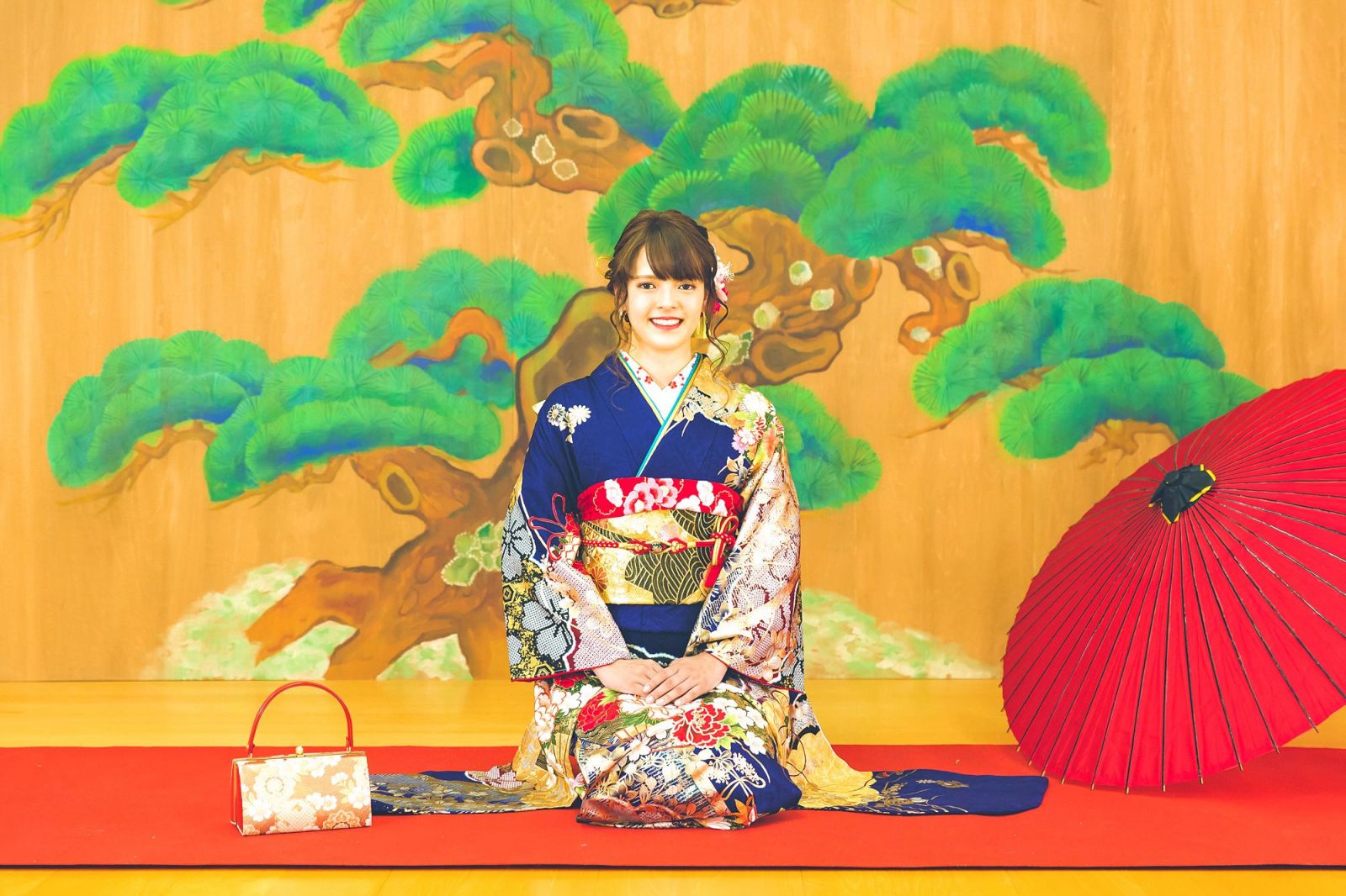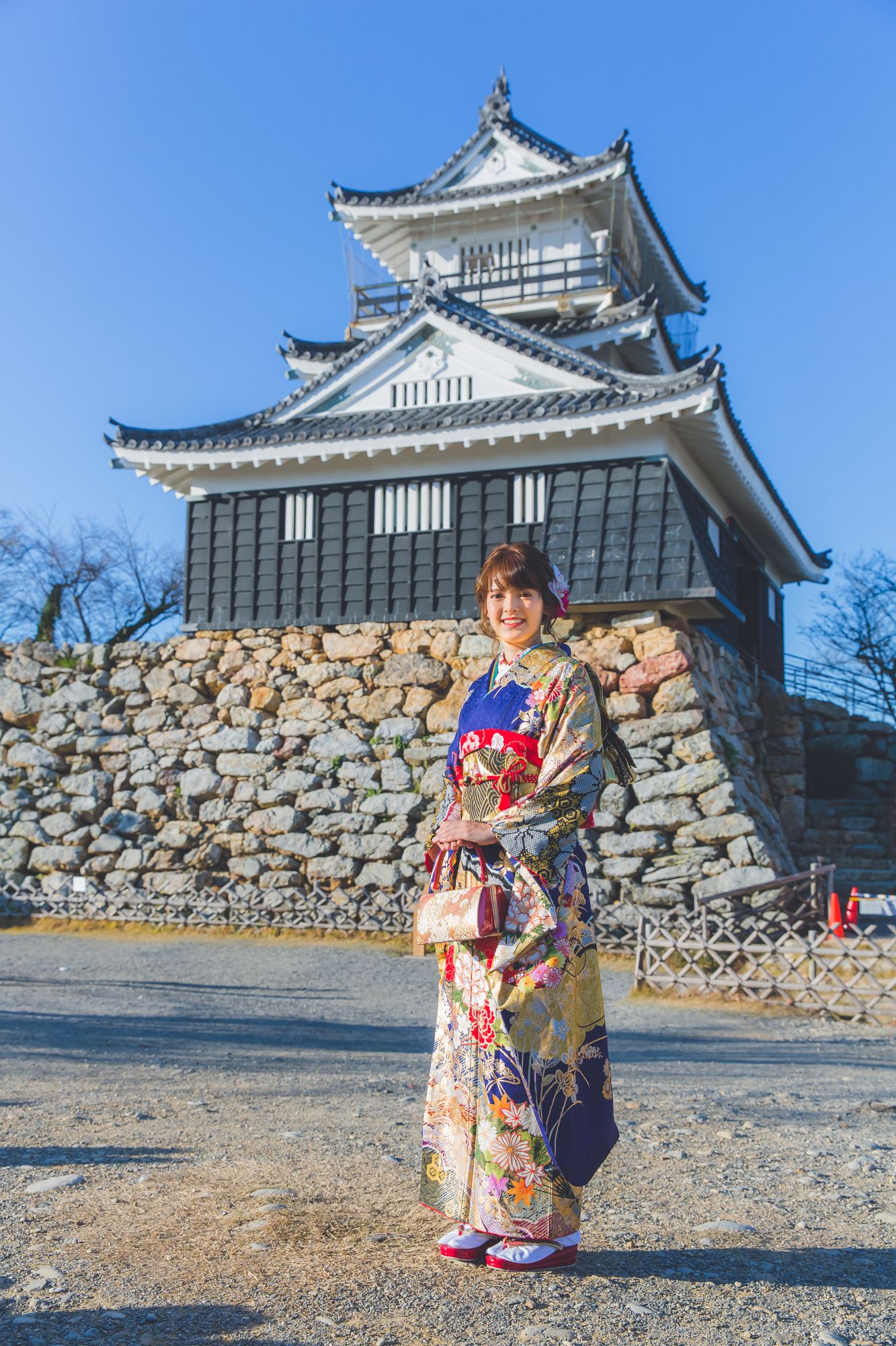 能の稽古舞台「ゆりの木舞台」を貸し切り、ヘアメイク・着付けした後、撮影させていただきます。その後浜松城公園に移動し、撮影させていただきます。