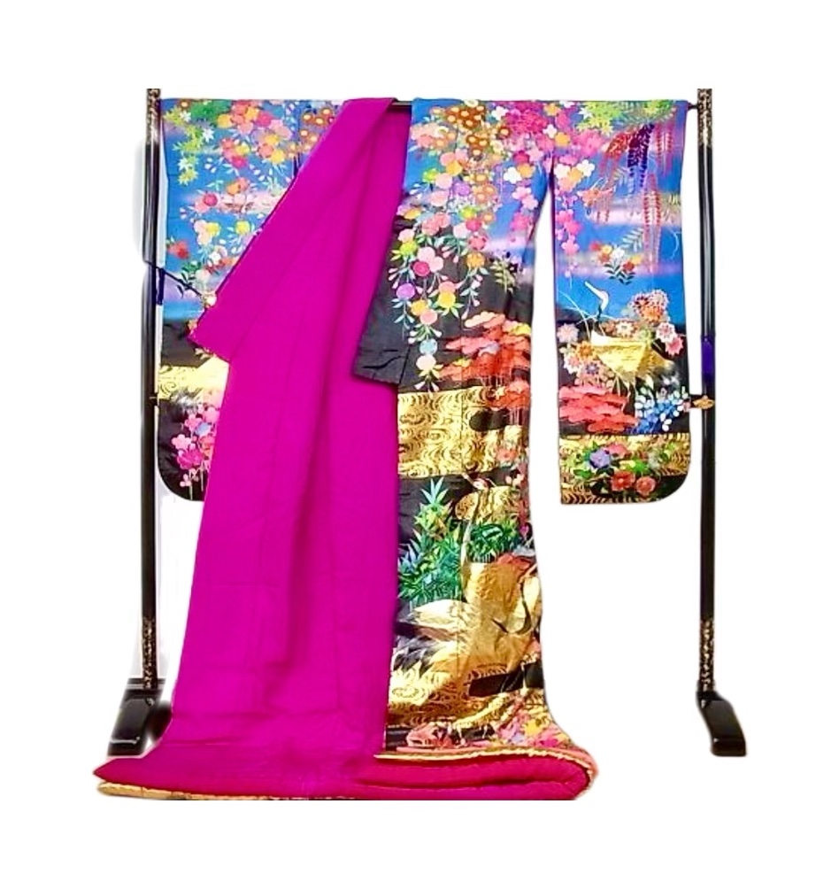 | 1 人気の赤と黒の弾き振袖。華やかな金箔や桜がちりばめられで披露宴会場のスポットライトを浴びるとより一層輝きます。 | 2 黒地に格式の松竹梅と祝い鶴を友禅で一筆一筆描き上げた最高級の引き振袖です。「秋山章ブランド」 |
